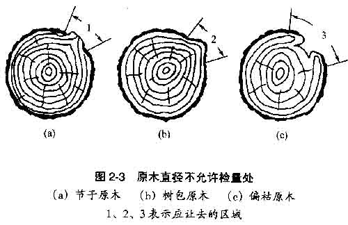 在某些特殊情況下,檢量原木直徑應注意: a.不允許在節子、樹包及凹陷處檢量,應讓去該部位(圖2-3)。